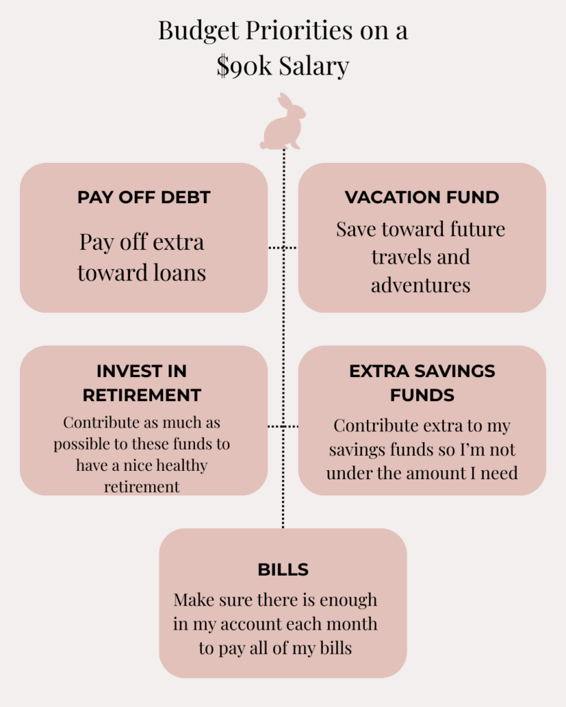 Step one is to make sure you are living within the means of your salary. Making $90,000 gives me a comfortable income that pays for my monthly bills and expenses and still have money left over for my goals.
